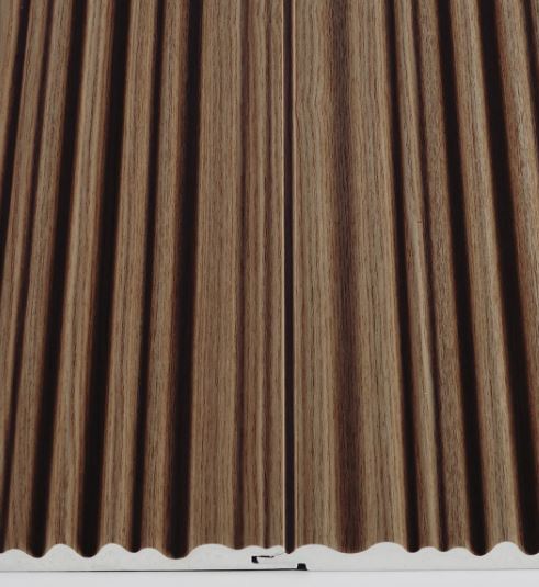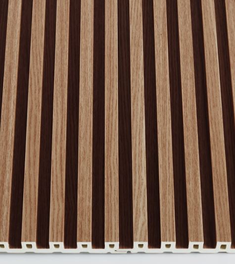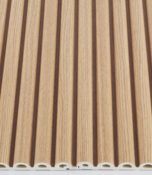 Collezione di rivestimenti in legno e tecnopolimeri in finitura effetto legno.